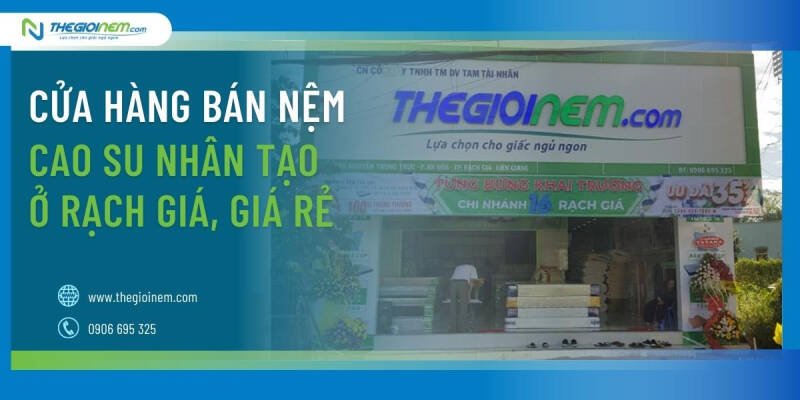 Bạn có thể mua nệm cao su nhân tạo tại Rạch Giá theo địa chỉ số 695 Nguyễn Trung Trực, P. An Hòa, TP. Rạch Giá. Số Hotline của cửa hàng bán nệm cao su nhân tạo Rạch Giá: 0906 695 325. Địa chỉ trên là một trong hơn 70 chi nhánh của hệ thống bán lẻ chăn ga gối nệm - Thegioinem.com. Do đó, bạn hoàn toàn có thể yên tâm lựa chọn cửa hàng Thế Giới Nệm Rạch Giá là nơi mua nệm cao su chính hãng, chất lượng và giá rẻ.